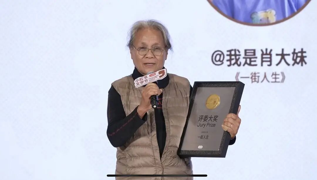 “大家好,我是肖大妹,今年七十岁,是个一生种地、磨豆腐的农村人。今天能站在这坨,我不敢相信,怀疑是在做梦。”70岁的广西桂林婆婆“肖大妹”,站在小红书文学节“身边写作大赛”的领奖台上,从资深出版人黄昱宁、作家淡豹手中接过“评委大奖”奖状。她用浓重的乡音发表获奖感言,打动了台下每一个人。